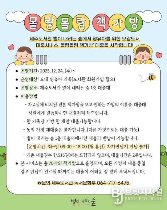 브릿지저널 정보영 기자 | 제주도교육청 제주도서관이 운영 중인 영유아 오감 도서 대출서비스 ‘몰랑몰랑 책가방’이 이용자들의 꾸준한 호응을 얻고 있다.
