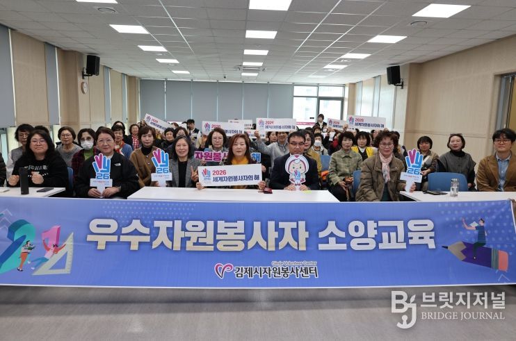 브릿지저널 윤나영 기자 | 김제시는 김제시자원봉사센터(센터장 남궁행원)가 지난 24일, 센터 2층 대회의실에서 김제시를 대표하는 우수자원봉사자 120여 명이 참석한 가운데 “2026 우수자원봉사자 소양교육”을 실시했다고 밝혔다.