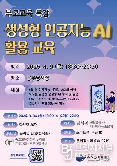 브릿지저널 윤나영 기자 | 속초교육문화관은 4월 9일 오후 6시 30분, 지역 서점 문우당서림 2층에서 2026년 부모교육 특강 ‘생성형 인공지능(AI) 활용’을 운영한다.
