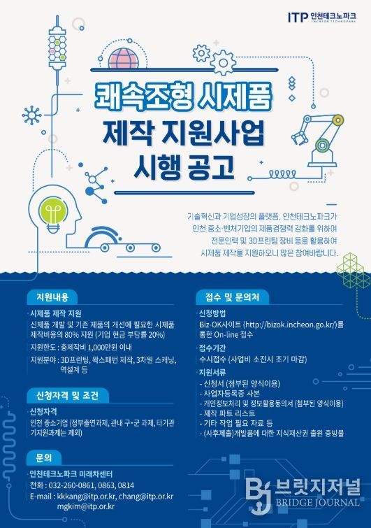 브릿지저널 김경미 기자 | 인천테크노파크(인천TP)는 인천지역 중소기업을 대상으로 3D 프린팅과 역설계 등을 활용한 ‘쾌속조형 시제품 제작 지원사업’의 참여기업을 모집한다고 밝혔다.