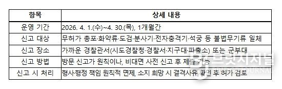 브릿지저널 김경미 기자 | 경찰청은 불법무기류로 인한 범죄와 사고를 미리 방지하기 위하여 국방부 및 행정안전부와 합동으로 4월 1일부터 30일까지 한 달간 '2026년 1차 불법무기류 자진신고 기간'을 운영한다.