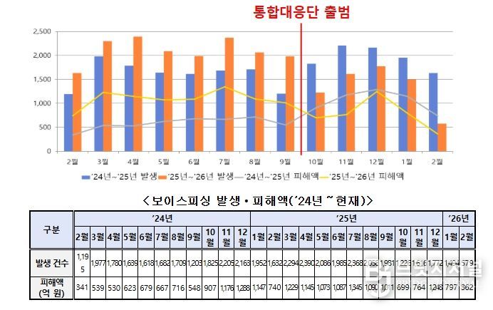 특히, 보이스피싱은 통상적으로 매년 4분기에 이전 분기보다 크게 증가하는 경향이 있었으나(’24년 ㅿ3분기 4,594건 → ㅿ4분기 6,193건, 34.8%↑), 통합대응단이 출범한 ’25년 4분기에는 오히려 이전 3분기보다 27.9% 감소(’25년 ㅿ3분기 6,407건 → ㅿ4분기 4,614건) 하여 ‘연말 피싱 특수’를 처음으로 억제했으며, 통합대응단 체계가 안착한 ’26년 2월에는 전년 동월 대비 발생 건수가 무려 64.5%(1,632건→579건) 감소했다.
