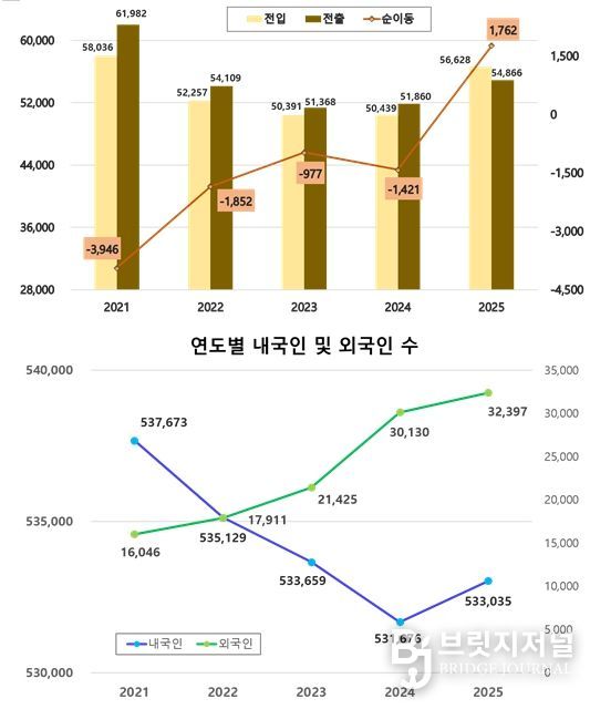 특히 내국인 인구는 53만3,035명으로 전년 대비 1,359명 증가하며 2020년 이후 지속되던 감소세에서 벗어나 반등세로 전환됐다.