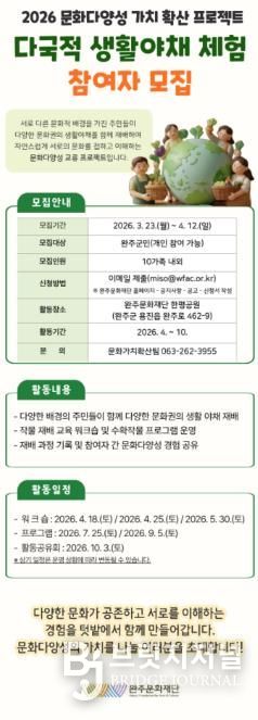 완주문화재단 관계자는“다국적 생활야채 체험은 서로 다른 문화적 배경을 가진 주민들이 함께 참여하는 과정에서 문화다양성을 이해하고 확장해가는 프로젝트”라며 “군민들이 서로의 다름을 존중하고 공존하는 경험으로 이어지길 기대한다”고 전했다.