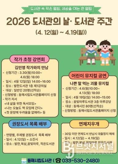브릿지저널 윤나영 기자 | 동해시는 2026년 도서관의 날·도서관주간을 기념하여'도서관 속 작은 펼침, 세상을 여는 큰 열림'이라는 공식 주제로 ‘제62회 도서관 주간(4.12.~4.19.)’을 운영한다고 밝혔다.