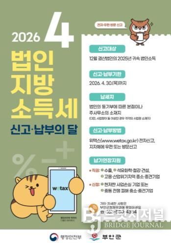 브릿지저널 윤나영 기자 | 부안군은 관내에 사업장을 둔 12월 결산법인을 대상으로 오는 4월 1일부터 30일까지 2025년 귀속분 소득에 대한 ‘법인지방소득세 집중신고기간’을 운영한다고 밝혔다.
