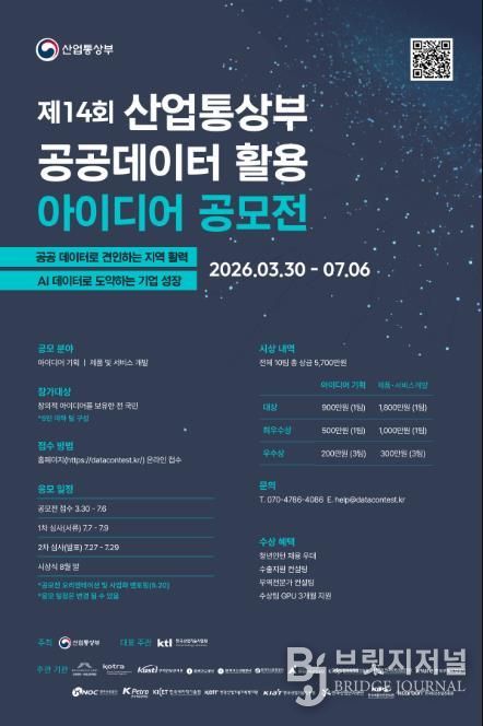 브릿지저널 김경미 기자 | 산업통상부는 산업기술시험원 등 산하 공공기관과 함께 3월 30일∼7월 6일까지 '제14회 공공데이터 활용 아이디어 공모전'을 개최한다.