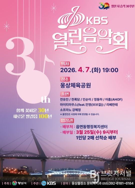 브릿지저널 김경미 기자 | 양산시가 시 승격 30주년을 기념하고 ‘2026 양산방문의 해’를 널리 알리기 위해 4월 7일(화) 저녁 7시 웅상체육공원 축구장에서‘KBS 열린음악회’를 개최한다고 밝혔다.