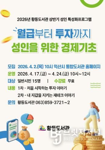 익산시 황등도서관은 오는 4월 17일과 24일, '월급부터 투자까지: 성인을 위한 경제 기초'라는 주제로 특성화 프로그램을 운영한다.