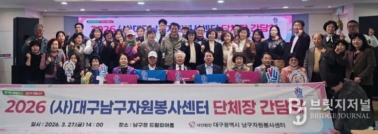브릿지저널 김진석 기자 | (사)대구남구자원봉사센터(이사장 이흥우)는 지난 27일 남구청 드림피아홀에서 ‘2026 자원봉사 단체장 간담회’를 개최했다.