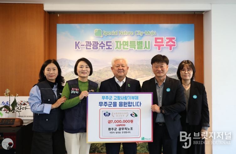 브릿지저널 윤나영 기자 | 전북특별자치도 완주군 공무직 노조(전국자치단체 공무직본부 완주군지부)원 70명이 지난 31일 무주군에 고향사랑기부금 7백만 원을 기부했다.