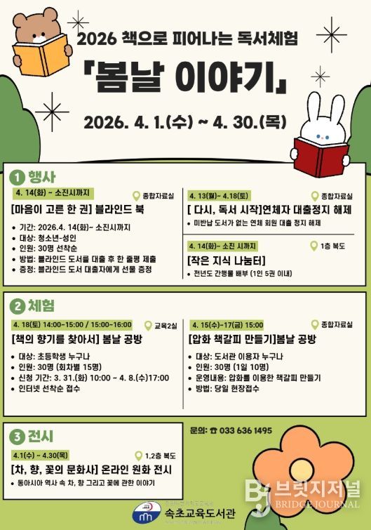 브릿지저널 윤나영 기자 | 속초교육도서관은 4월 1일부터 30일까지 ‘2026년 책으로 피어나는 독서 체험 '봄날 이야기'’ 행사를 운영한다.