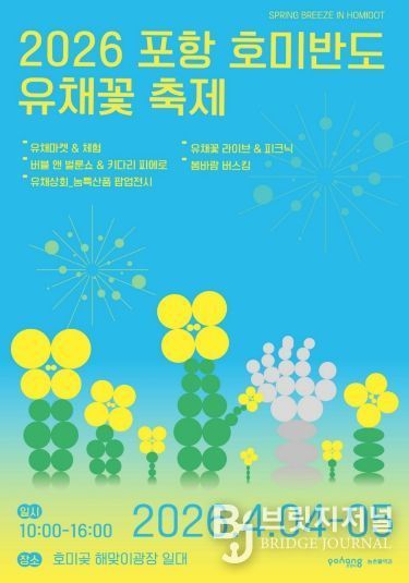 브릿지저널 정보영 기자 | 노란 유채꽃 물결이 일렁이는 봄을 맞아 포항을 대표하는 봄꽃 행사인 ‘2026 포항 호미반도 유채꽃 축제’가 내달 4일부터 5일까지 이틀간 호미곶 해맞이광장에서 개최된다.