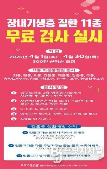 브릿지저널 정보영 기자 | 포항시 남·북구보건소는 지역 주민을 대상으로 장내 기생충질환 무료 검사를 실시한다. 남구보건소는 4월, 북구는 5월부터 시작하며, 보건소별로 300명을 선착순 모집한다.