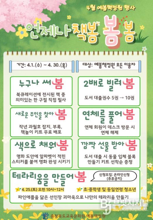 브릿지저널 김경미 기자 | 충청북도교육청 직속기관 교육문화원은 예봄책정원에서 충북 도민들이 책과 함께 따뜻한 봄을 만끽할 수 있는 독서행사 '언제나 책봄‧봄‧봄'을 4월 한 달간 운영한다.