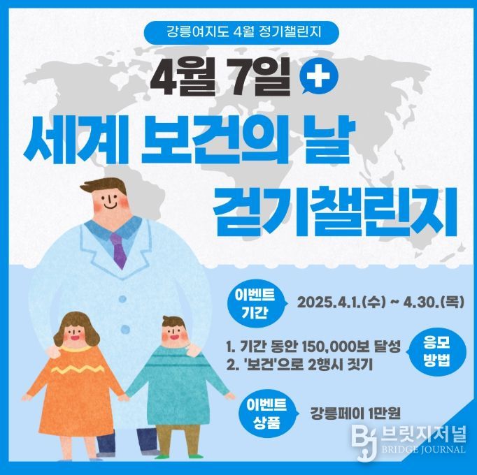 브릿지저널 윤나영 기자 | 강릉시는 4월 7일 보건의 날을 맞아 시민들의 건강생활 실천 분위기 조성을 위해 '보건의 날 기념 걷기챌린지'와 '걷기동아리 명품길 걷기프로그램'을 운영한다.