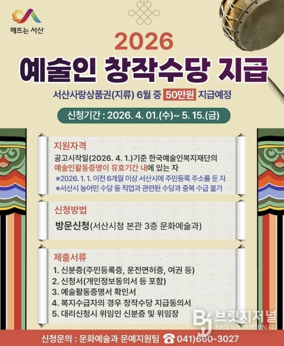 신청 기간은 4월 1일부터 5월 15일까지며, 서산시 문화예술과에 방문 신청하면 된다.