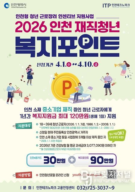 브릿지저널 김경미 기자 | 인천광역시는 중소기업 재직 청년들의 근로 의욕을 높이기 위해 ‘인천 재직청년 복지포인트 지원사업’의 참여자를 4월 1일부터 4월 10일까지 모집한다고 밝혔다.