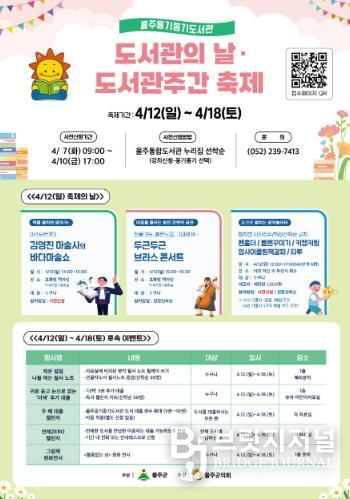 브릿지저널 윤나영 기자 | 울주옹기종기도서관이 ‘도서관의 날(4월 12일)’과 ‘도서관 주간(4월 12~18일)’을 맞아 독서문화 확산과 도서관 이용 활성화를 위한 다양한 특별행사를 운영한다고 1일 밝혔다.