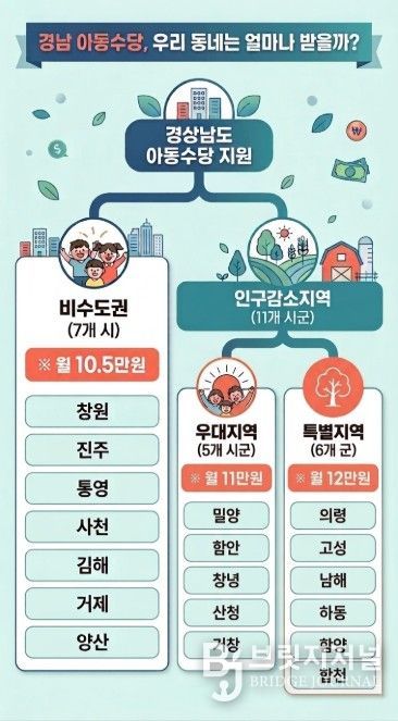 도 내 거주하는 아동은 기존 월 10만 원에서 10만 5천 원으로 수당이 인상된다. 특히 밀양시, 의령군 등 인구감소지역에 거주할 경우 월 11만 원에서 최대 12만 원까지 받을 수 있다.