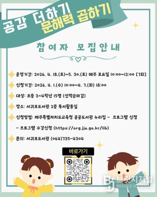 브릿지저널 정보영 기자 | 제주도교육청 서귀포도서관은 18일부터 초등 3~4학년 15명을 대상으로 ‘공감 더하기 문해력 곱하기’를 운영하며 참가자를 선착순 모집한다.