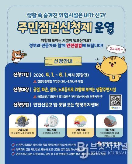 특히 군은 주민이 직접 점검이 필요한 시설을 신청하는 ‘주민점검신청제’를 집중 운영한다. 신청 기간은 4월 1일부터 6월 1일까지이며, 마을회관이나 경로당 등 생활 밀착형 시설이 주요 대상이다. 안전신문고 앱 또는 읍·면 행정복지센터 방문을 통해 신청 가능하며, 공사 중이거나 소송·분쟁 중인 시설 등은 제외된다.