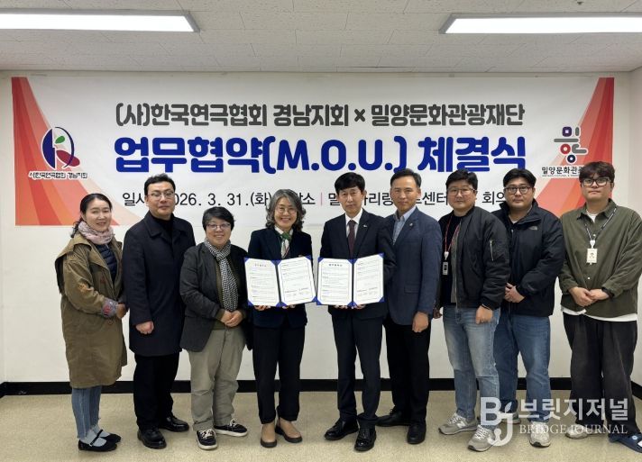 브릿지저널 김경미 기자 | 밀양문화관광재단은 지난 3월 31일 밀양아리랑아트센터 회의실에서 한국연극협회 경남지회와 지역 연극 예술의 저변 확대와 문화 발전을 위한 업무협약(MOU)을 체결했다.