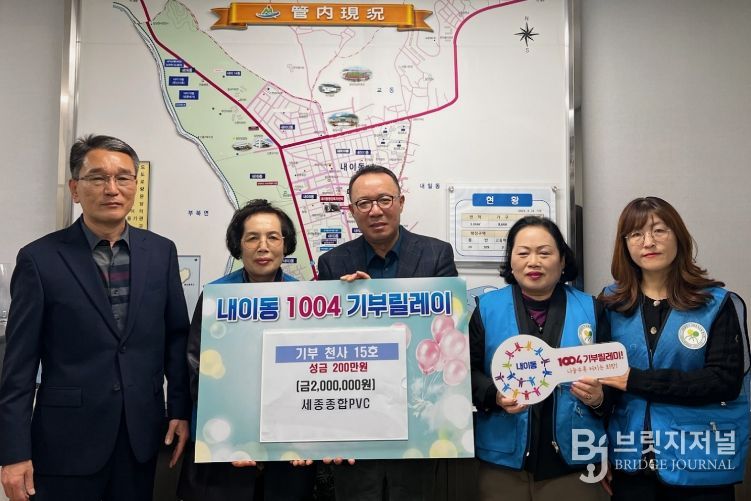 브릿지저널 김경미 기자 | 밀양시 내이동 세종종합PVC(대표 정병욱)은 1일 ‘100+4 기부릴레이 시즌2’에 15호로 참여하며 내이동 자원봉사회에 200만 원을 기탁했다.