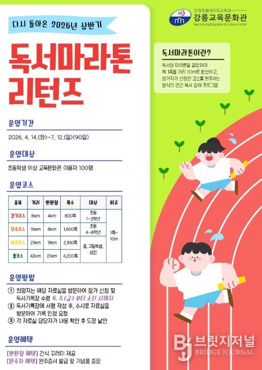 브릿지저널 윤나영 기자 | 강릉교육문화관은 지역 내 책 읽는 문화 확산을 위해 4월부터 12월까지 학생 및 성인을 대상으로 ‘2026년 독서마라톤 리턴즈’를 운영한다.