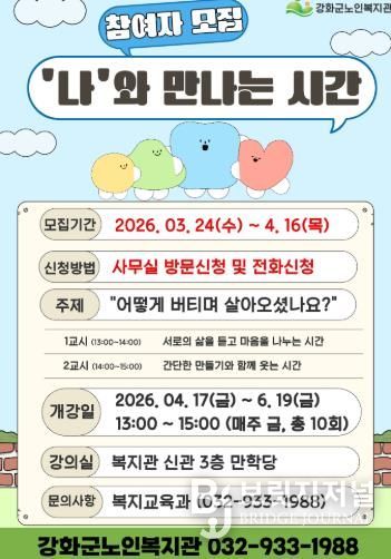 브릿지저널 김경미 기자 | 강화군노인복지관이 어르신들의 정서적 안정과 사회적 관계 형성을 지원하는 이야기 나눔 모임 '‘나’와 만나는 시간'의 참여자를 모집한다고 밝혔다.