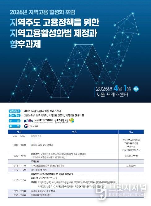브릿지저널 김경미 기자 | 고용노동부 한국고용정보원은 사단법인 한국지역고용학회와 공동으로 4월 1일 서울 프레스센터에서'2026년 지역고용 활성화 포럼'을 개최한다. 이번 포럼은 ‘지역 주도 고용정책을 위한 지역고용활성화법 제정과 향후 과제’를 주제로, 지역 주도 고용정책 실현을 위한 입법의 필요성을 공유하고 실효성 있는 정책과제를 논의하기 위해 마련됐다.