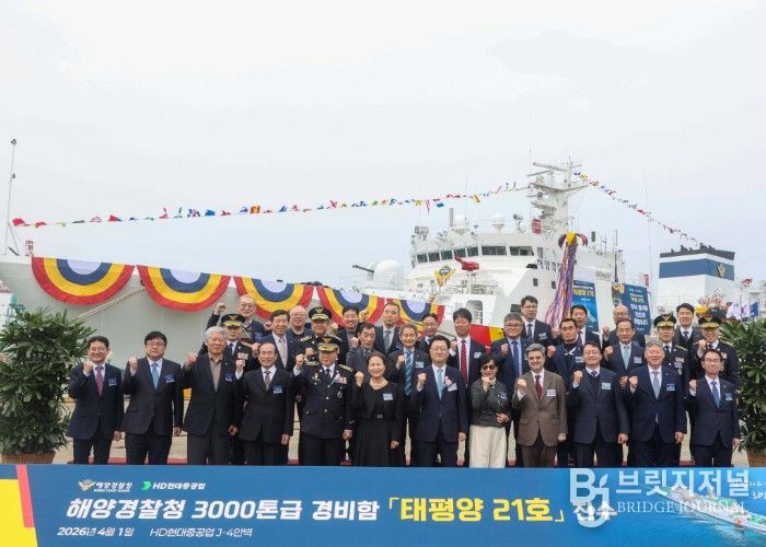 브릿지저널 윤나영 기자 | 해양경찰청은 4월 1일, 울산광역시 동구에 소재한 HD현대중공업㈜에서 3000톤급 신형 경비함 태평양 21호(3021함)의 진수식을 개최했다.