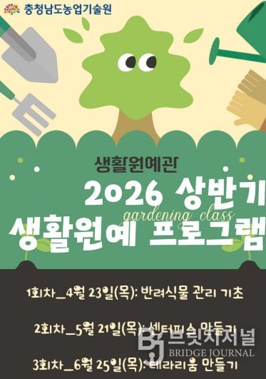 브릿지저널 정보영 기자 | 충남도 농업기술원은 도민의 생활 속 식물문화 확산을 위해 ‘2026년 상반기 생활원예 프로그램’ 일반인 과정 참여자를 모집한다고 2일 밝혔다.