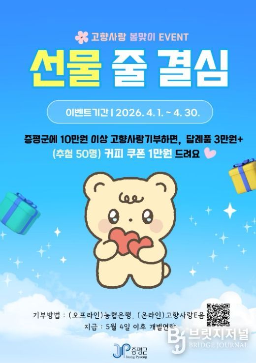 브릿지저널 김경미 기자 | 충북 증평군이 봄을 맞아 이달 30일까지 고향사랑기부 이벤트를 진행한다.