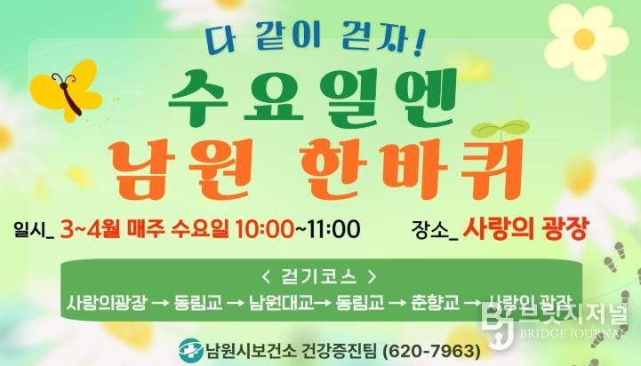 브릿지저널 윤나영 기자 | 남원시보건소가 시민의 건강 증진과 일상 속 운동 습관 형성을 위해 오는 4월부터 11월까지 걷기 실천 프로그램인 ‘수요일엔 남원 한바퀴’를 운영한다.