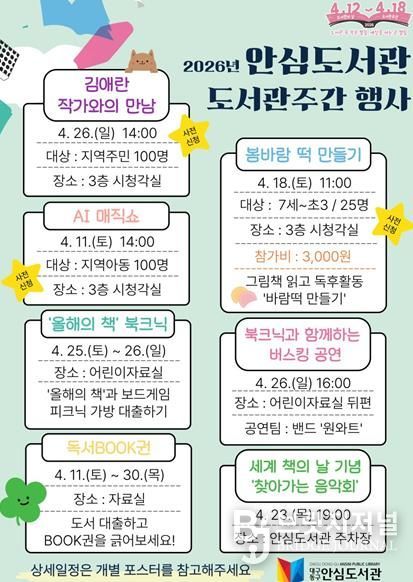 안심도서관은 ▲11일 ‘AI 매직쇼’ 공연 ▲18일 그림책 독후활동 ‘봄바람 떡 만들기’ 체험 ▲23일 세계 책의 날 기념 ‘찾아가는 음악회’ 공연 ▲11일~30일 도서대출자에게 제공하는 ‘독서BOOK권’ 참여 ▲26일 ‘북크닉과 함께 즐기는 버스킹’ 공연과 2026년 올해의 책 선정도서『안녕이라 그랬어』저자 ‘김애란 작가와의 만남’을 준비했다.