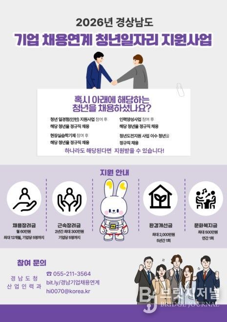 브릿지저널 김경미 기자 | 경상남도는 기업과 대학 간 협약을 통해 구인·구직간 미스매치를 해소하기 위해 준계약학과 방식으로 ‘기업 채용연계 청년일자리 지원사업’을 추진하고 있다고 밝혔다.