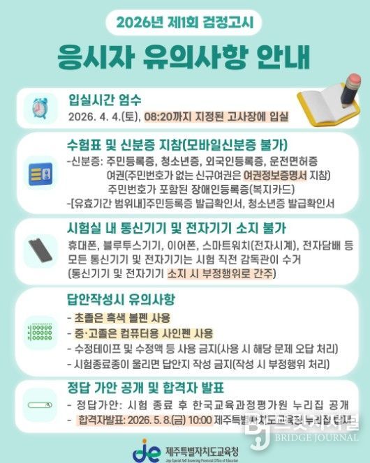 브릿지저널 정보영 기자 | 제주특별자치도교육청은 4일 ‘2026년도 제1회 초졸·중졸·고졸 검정고시’를 제주중앙중학교, 서귀중앙여자중학교, 제주교도소, 제주소년원 등 4곳에서 실시한다.