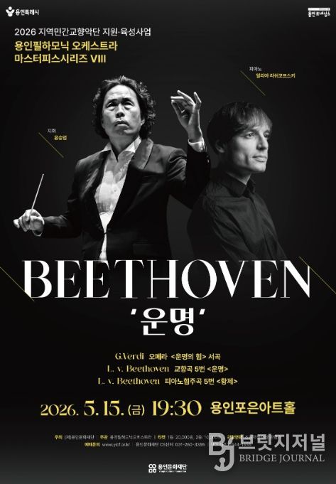 브릿지저널 김경미 기자 | 용인문화재단은 오는 5월 15일 오후 7시 30분 용인포은아트홀에서 ‘2026년 지역민간교향악단 지원·육성사업’의 첫 공연으로 용인필하모닉오케스트라의 기획공연 '마스터피스 시리즈 Ⅷ - 베토벤 ‘운명’'을 선보인다.