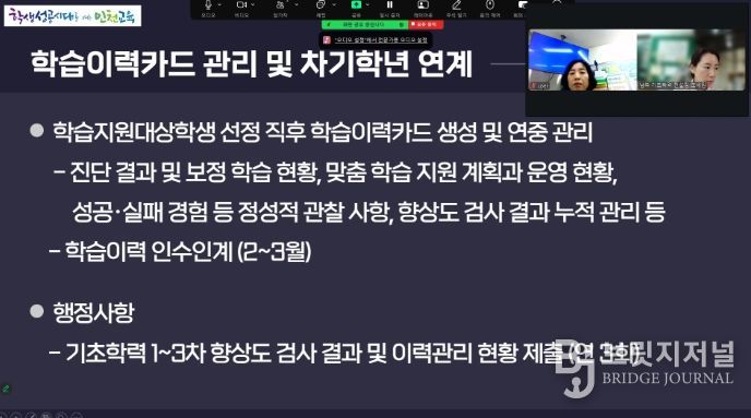 주요 내용은 ▲기초학력 보장 계획 및 예산 활용 점검 ▲학습 지원대상학생 지원협의회 운영 ▲지원 프로그램 미참여 학생 지원 방안 ▲기초학력 보장 프로그램 운영 ▲성장기록 프로그램 활용 방법 등이다.