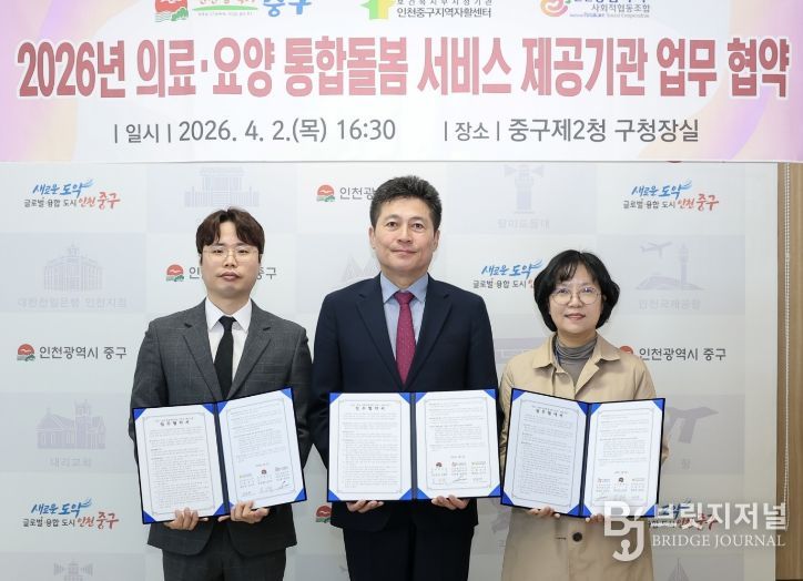 브릿지저널 김경미 기자 | 인천시 중구는 촘촘하고 든든한 ‘지역사회 통합돌봄망’ 구축을 위해 지난 2일 제2청 구청장실에서 복지 서비스 제공기관, 의료기관과 잇따라 업무 협약을 체결했다고 밝혔다.