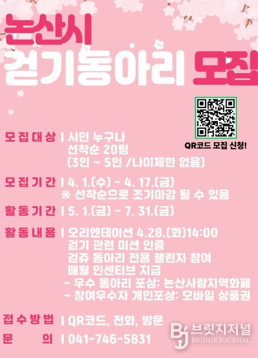 브릿지저널 정보영 기자 | 논산시는 오는 17일까지‘비대면 걷기동아리’참여자를 모집한다.