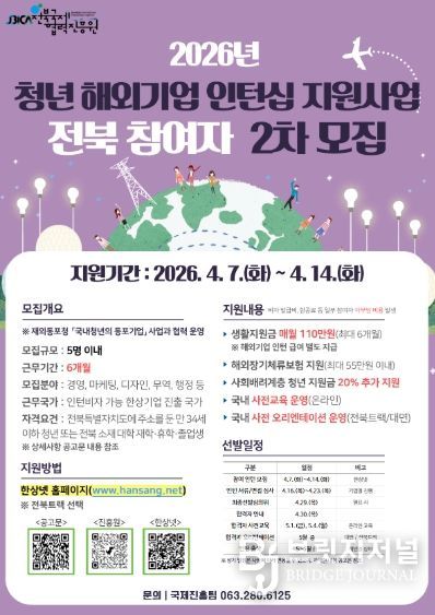 브릿지저널 윤나영 기자 | (재)전북국제협력진흥원은 도내 청년의 해외 진출과 글로벌 역량 강화를 위해 '청년 해외기업 인턴십 지원사업' 참여자를 오는 4월 7일부터 4월 14일까지 모집한다고 밝혔다.