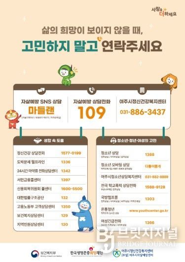 한편, 여주시민은 우울이나 불안 등으로 전문가의 도움이 필요한 경우 자살예방상담전화(109), 정신건강상담전화, 자살예방SNS상담 ‘마들랜’, 여주시정신건강복지센터(부설)자살예방센터를 통해 상담을 받을 수 있다.