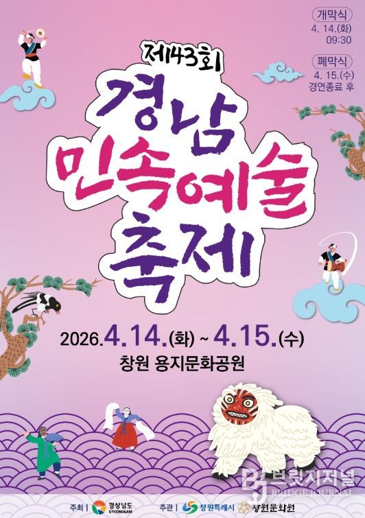 브릿지저널 김경미 기자 | 창원특례시는 오는 4월 14일부터 15일까지 이틀간 창원 용지문화공원에서 “제43회 경남민속예술축제”를 개최한다고 밝혔다.