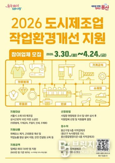 브릿지저널 김경미 기자 | 서울 용산구가 오는 24일까지 ‘도시제조업 작업환경개선 지원사업’에 참여할 지역 내 업체를 모집한다. 영세하고 노후화한 작업장 내 위해요인을 제거하고 설비를 개선해 작업능률을 향상시키기 위한 취지에서다.
