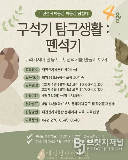 브릿지저널 정보영 기자 | 대전선사박물관은 4월 18일 오전과 오후 두 차례에 걸쳐 가족 대상 교육 프로그램 ‘구석기 탐구생활’을 운영한다.