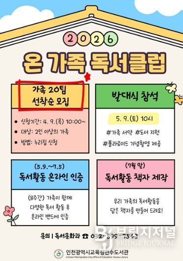 브릿지저널 김경미 기자 | 인천광역시교육청연수도서관은 5월 9일부터 가족이 함께 책을 매개로 소통하며 성장하는 ‘온 가족 독서클럽’을 운영한다.