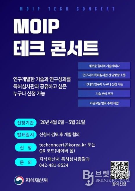 브릿지저널 김경미 기자 | 지식재산처는 4월 6일~5월 31일까지 기업 및 연구소가 개발하거나 연구한 최신 기술을 특허심사관과 공유하고, 연구자와 특허심사관과의 직접적인 소통을 강화하기 위한 ‘지식재산처(MOIP) 기술 공연(MOIP Tech Concert)'에 참여할 우수 연구자를 모집한다고 밝혔다.