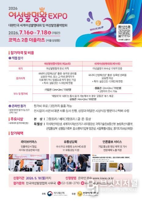 브릿지저널 김경미 기자 | 지식재산처와 한국여성발명협회는 2026년 7월 개최되는 ‘2026 여성발명왕EXPO’에 참가할 여성발명·기업인들을 4월 6일~5월 18일까지 모집한다고 밝혔다.